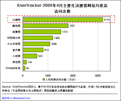 報告指出,經(jīng)過幾年的發(fā)展,國內生活搜索發(fā)展的格局日趨明朗,口碑網(wǎng)、酷訊、趕集網(wǎng)等網(wǎng)站逐漸脫穎而出。其中,借助阿里巴巴集團強勁的資源優(yōu)勢,2004年成立的口碑網(wǎng)已發(fā)展成國內最大的生活搜索網(wǎng)站。其用戶月度總訪問次數(shù)3194萬次,幾為第2位的酷訊網(wǎng)1821萬次和第3位趕集網(wǎng)1516萬次的總和。在人均月度訪問次數(shù)上,口碑網(wǎng)也以1.85次居榜首。