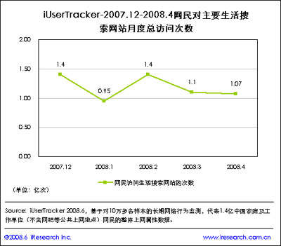 調查顯示,2007年12月用戶對生活搜索網(wǎng)站的月度總訪問次數(shù)為1.04億次,2008年1月份顯著下降,為0.66億次,艾瑞考察整體網(wǎng)民總體的訪問次數(shù)發(fā)現(xiàn),出現(xiàn)這一現(xiàn)象的原因在于網(wǎng)民的總體訪問次數(shù)整體呈下降趨勢,主要受元旦和春節(jié)等節(jié)假日影響;此后網(wǎng)站訪問總次數(shù)呈穩(wěn)步上升趨勢。