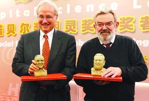 昨日,諾獎得主馬丁努恩·韋爾特曼(右)和圖靈獎獲得者巴特勒·萊普森(左)接受首都科學講堂送給他們的頭像雕塑。本報記者 浦峰 張濤 攝