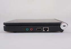 昭陽M10的機身側(cè)面接口比較簡單,但也涵蓋了基本的使用需求。機身前端沒有設置任何功能接口,不過內(nèi)置了一組雙聲道立體聲音響,在閑暇時放上一段舒心的音樂也是不錯的選擇。機身右側(cè)設置了一對音頻I/O接口、一枚USB2.0接口、一枚RJ45網(wǎng)絡接口以及轉(zhuǎn)軸上的安全鎖孔,左側(cè)除電源插孔外還加入了VGA視頻接口、SD讀卡器以及USB2.0接口,足以滿足外接存儲設備或顯示設備的需要。