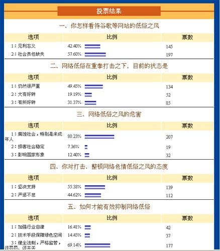 調查一推出就受到了的網民關注,他們積極參與投票和留言。截至目前,55.38%的網友選擇了堅決支持打擊、整頓網絡色情低俗之風;69.14%的網友投票要求有關部門“健全法制,嚴格監(jiān)管,該罰罰,該關關”。