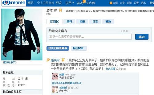 人人網(wǎng)明星主頁上的眾多明星們:光良、尚雯婕、游鴻明、段奕宏、王寶強等,還有世界小姐張梓琳和王靜瑤以及以那多為代表的新一代年輕作家都紛紛更新自己的狀態(tài)表示對恩師的問候,有的明星還在主頁上講述自己學(xué)生時代的趣事,而機構(gòu)主頁中的《環(huán)球時報》和光線傳媒《最佳現(xiàn)場》等也是在主頁上更新了教師節(jié)狀態(tài)以此表示對老師們的敬意。從電話、短信、電子郵件,表達祝福的方式在不斷演進,當(dāng)前社交網(wǎng)站因其基于真實用戶而產(chǎn)生的真實情感,成為人們表達祝福的最新選擇。