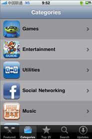 ⑵:展示App Store中軟件分類的列表。用戶可點(diǎn)擊列表中的某個分類查看該類別的所有軟件