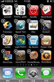 凡通過AppStore下載的軟件均可通過數(shù)步簡單操作完成刪除操作,以刪除“iDay”軟件為例說明刪除軟件的一般步驟:手指按壓“iDay”圖標(biāo),數(shù)秒鐘后圖標(biāo)將出現(xiàn)抖動狀態(tài),同時在圖標(biāo)左上方出現(xiàn)“ ”圖標(biāo),此時只需點(diǎn)擊“ ”即可完成刪除操作,如不再需要刪除軟件時,只需單擊“Home”鍵,圖標(biāo)即恢復(fù)到非抖動狀態(tài)。