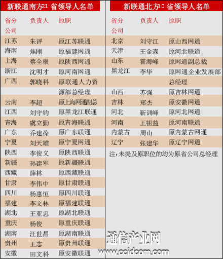 隨著新聯(lián)通省、市、縣級(jí)組織架構(gòu)的確定,各省市相關(guān)領(lǐng)導(dǎo)已經(jīng)確定,如原山西網(wǎng)通的總經(jīng)理劉守江為新聯(lián)通北京市分公司負(fù)責(zé)人,而原湖北聯(lián)通總經(jīng)理王亞忠則仍留任新聯(lián)通湖北分公司負(fù)責(zé)人(詳見上表)。據(jù)了解,在新聯(lián)通省分公司的負(fù)責(zé)人中,原聯(lián)通與原網(wǎng)通的高管比例基本上為1:1,堅(jiān)持均衡原則。這也印證了此前中國聯(lián)通董事長(zhǎng)常小兵的觀點(diǎn),在新聯(lián)通內(nèi)部機(jī)構(gòu)設(shè)置和負(fù)責(zé)人安排的工作上,主要遵循適應(yīng)發(fā)展需要、確保平穩(wěn)過渡、兼顧當(dāng)前及今后、合理均衡配備等四項(xiàng)原則!霸谥饕(fù)責(zé)人的安排上,注重了原中國網(wǎng)通和原中國聯(lián)通干部的總體均衡。”常小兵說。