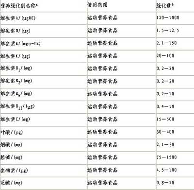 二、營養(yǎng)強(qiáng)化劑:建議運(yùn)動營養(yǎng)食品中食品營養(yǎng)強(qiáng)化劑的使用按《運(yùn)動營養(yǎng)食品中營養(yǎng)強(qiáng)化劑使用規(guī)定》(附表)中規(guī)定執(zhí)行。