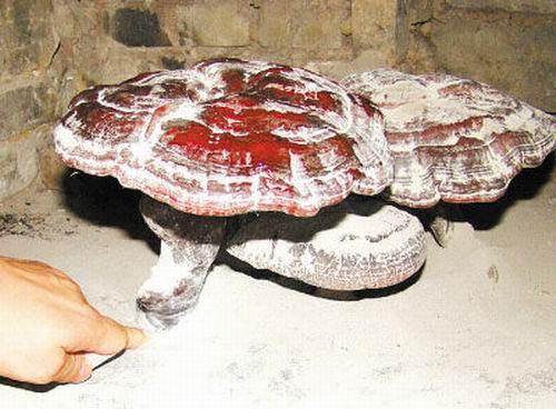 赤靈芝民間稱靈芝草。多孔菌科,是一種藥用真菌。外形頗似一株五彩蘑菇,“蘑菇蓋”呈不規(guī)則云朵形,有環(huán)紋與輻射狀的皺紋相穿插;“蓋”的下面有眾多的細密菌管孔洞;梗側(cè)生于“蓋”下,光澤如漆。每逢夏季,泰山氣溫漸高,林間相對濕度逐漸增大,陽光散射,形成泰山靈芝迅速生長的有利條件。秋末,可在柞、楓朽木樁旁采到。全株入藥,有治耳聾、利關(guān)節(jié)、保神、益精氣、堅盤骨、療虛勞、滋補強壯等功能。(徐庶)