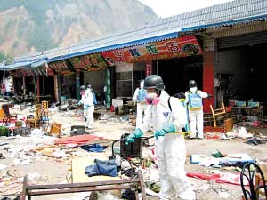 北川縣城是重災(zāi)區(qū),防疫消毒的任務(wù)非常艱巨。在不斷的余震中,廣州檢驗(yàn)檢疫隊(duì)員分成兩組,穿梭在危樓之間噴灑藥物。
