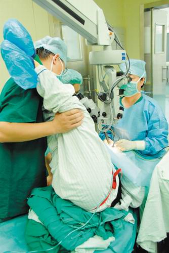 昨天(10月16日)14:00左右,躺在手術(shù)車上的一名女患者被護(hù)士推到了天津醫(yī)科大學(xué)眼科中心的手術(shù)室。與其他病人不同,病人雖然上半身躺在床上,但臀部以下的雙腿卻是高高抬起。負(fù)責(zé)手術(shù)的張紅主任介紹說(shuō),這名50歲的女患者已經(jīng)患有40多年的類風(fēng)濕關(guān)節(jié)炎。長(zhǎng)期病患使得她的四肢與脊柱嚴(yán)重畸形,身體只能始終呈90度的彎曲,不能平身。近日,這名女患者眼部的白內(nèi)障不斷加重,已經(jīng)面臨失明,只有通過(guò)手術(shù)才能讓她重見(jiàn)光明。雖然這名患者的眼睛手術(shù)本身并不復(fù)雜,但她特殊的身體情況是該院建院近20年來(lái)的罕見(jiàn)病例。