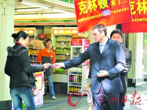 昨日,一位名叫“克林頓”的人在東莞街頭給消費(fèi)者免費(fèi)派發(fā)其代言的安全套(見(jiàn)上圖)。不過(guò),這位“克林頓”可不是前美國(guó)總統(tǒng)比爾·克林頓,而叫威廉·比利·克林頓,加拿大人。對(duì)于商家的宣傳手法,有市民質(zhì)疑這是借美國(guó)前總統(tǒng)克林頓的名字來(lái)制造噱頭。(記者 周偉涵 通訊員 黃菲 攝)
