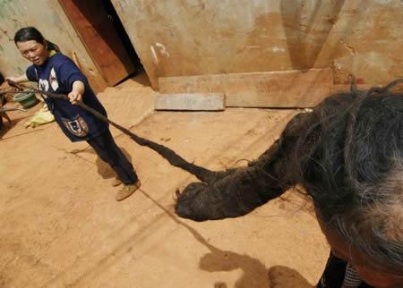 劉老太為什么要養(yǎng)這么多年的長發(fā)呢?“邪啊!”老人說,10歲那年,她突然得了一種病,當(dāng)?shù)厝私泻畾獠。那次病了一個(gè)月,病好了,她的父母請當(dāng)?shù)匾粋(gè)算命先生給她算了算,先生說她只要留著長發(fā)就不會(huì)生病了,當(dāng)時(shí)她還小不懂事,什么都聽父母的。從那時(shí)起,她就開始養(yǎng)長發(fā)了。后來父母死了,但她相信算命先生的話,仍然堅(jiān)持著。