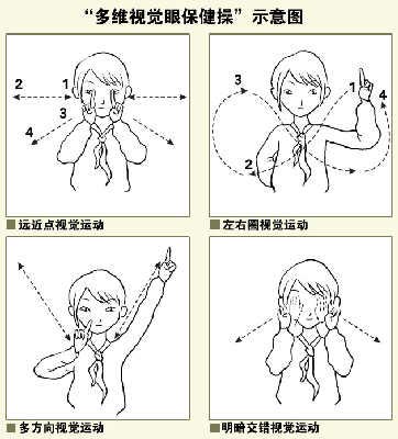 據(jù)介紹,“多維視覺眼保健操”時長5分鐘,分“遠近點視覺運動”、“左右圓線視覺運動”、“多方向視覺運動”、“明暗交替視覺運動”4節(jié)。做操時,或雙手食指豎起,向前后上下左右方向伸出,或單手在眼前畫8字;眼睛始終盯著手指,隨著手指運動調(diào)整目光。