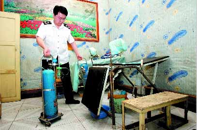 經(jīng)查,該門診部?jī)?nèi)仍存放有大量藥品,一個(gè)小房間內(nèi)放著兩臺(tái)婦科檢查床,還有氧氣瓶和吸宮器等物,沒(méi)有任何消毒措施,緊鄰的則是一個(gè)簡(jiǎn)陋病房,里面有4張病床。就是這個(gè)臟亂的黑診所,門牌居然醒目地標(biāo)著“婦產(chǎn)”、“人流”、“引產(chǎn)”等字樣。