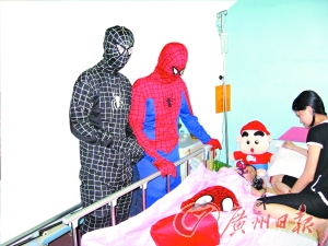 昨日上午9時30分許,在汕頭大學(xué)第一附屬醫(yī)院北樓三層的兒科病房的走廊上,突然出現(xiàn)了兩個與周圍環(huán)境不太相襯的角色,立刻引起了一陣不小的轟動!皟蓚男的,一個穿紅衣服,一個穿黑衣服,都蒙著臉!眱嚎撇》42床上的小患者母親黃海璇回憶當(dāng)時的情景,這兩個人的裝扮就和電影里的“蜘蛛俠”一模一樣,徑直來到了她眼前,然后把蜘蛛俠玩具放到了病床上。