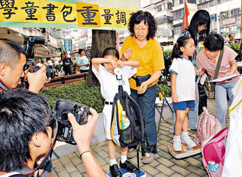 香港學(xué)童書包超重嚴(yán)重,雖然醫(yī)學(xué)界建議書包重量不超過體重10%,但早前民建聯(lián) 一項(xiàng)調(diào)查顯示,香港學(xué)童書包重量平均達(dá)3.9公斤,最重更達(dá)7公斤,其中有一年級學(xué)童書包超重最為嚴(yán)重,平均比標(biāo)準(zhǔn)重量高出近49%。