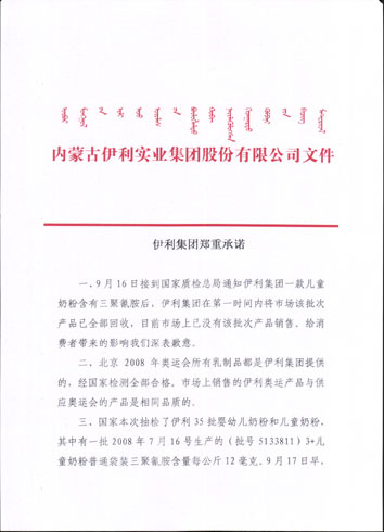 中新網(wǎng)9月17日電 伊利集團(tuán)今日發(fā)表聲明稱,16日在接到國(guó)家質(zhì)檢總局通知伊利集團(tuán)一款兒童奶粉含有三聚氰胺后,伊利集團(tuán)在第一時(shí)間內(nèi)將市場(chǎng)該批次產(chǎn)品已全部回收,目前市場(chǎng)上已沒有該批次產(chǎn)品銷售。同時(shí)為給消費(fèi)者帶來的影響深表歉意。