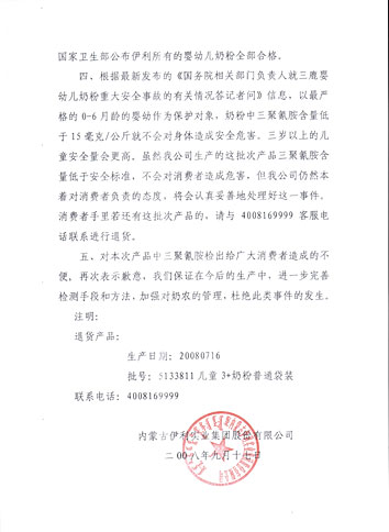 四、根據(jù)最新發(fā)布的《國(guó)務(wù)院相關(guān)部門負(fù)責(zé)人就三鹿嬰幼兒奶粉重大安全事故的有關(guān)情況答記者問》信息,以最嚴(yán)格的0-6月齡的嬰幼作為保護(hù)對(duì)象,奶粉中三聚氰胺含量低于15毫克/公斤就不會(huì)對(duì)身體造成安全危害。三歲以上的兒童安全量會(huì)更高。雖然我公司生產(chǎn)的這批次產(chǎn)品三聚氰胺含量低于安全標(biāo)準(zhǔn),不會(huì)對(duì)消費(fèi)者造成危害,但我公司仍然本著對(duì)消費(fèi)者負(fù)責(zé)的態(tài)度,將會(huì)認(rèn)真妥善地處理好這一事件。消費(fèi)者手里若還有這批次產(chǎn)品的,請(qǐng)與4008169999客服電話聯(lián)系進(jìn)行退貨。