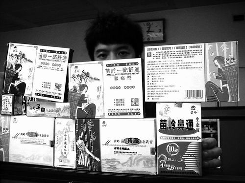 “我有鼻炎,常常鼻塞,有沒有什么好藥?”記者問!氨侨俊睜I(yíng)業(yè)員從柜臺(tái)里面又取出一盒藥說(shuō),“你用苗嶺鼻通生態(tài)液吧,也是全中藥,效果特別好。”