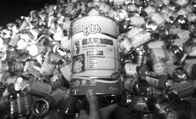 昨晚8時(shí)許,記者趕到漢陽(yáng)區(qū)廢舊物資回收總公司民友收購(gòu)站看到,空奶粉罐堆了一米多高,占據(jù)了一塊長(zhǎng)30多米,寬6米的空地,有“中老年高鈣奶粉、黃金組合配方嬰幼兒奶粉、學(xué)生高鈣鐵鋅奶粉、金裝嬰兒配方奶粉”等幾個(gè)品種,罐底標(biāo)注的生產(chǎn)日期從2005年到2008年8月不等,保質(zhì)期均為兩年。