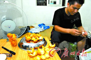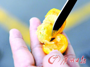 記者根據(jù)龔先生的引導,在石溪南約東街附近懷疑有問題的水果檔花2.5元買了25個金橘,一個一個剝開來后,發(fā)現(xiàn)總共15個里頭是有蛆的。蛆蟲呈米色,只有不到1厘米長,大都藏在果肉里頭,打開果皮后還能看到它在蠕動。有蛆的金橘摸上去都很軟,里頭的果肉組織往往被蟲蛀成一條條小通道。這種蛆金橘個頭比較小,有別于之前報道的曾發(fā)現(xiàn)蛆蟲的那種大柑橘。