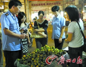 三水工商局在接到閔小姐情況反映后,立即派出工作人員及市場管理人員到該水果檔進行調(diào)查,并由市場管理人員將該水果檔正在出售的一堆橘子拿到農(nóng)業(yè)部門送檢,等待檢驗結(jié)果再作進一步處理。