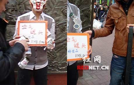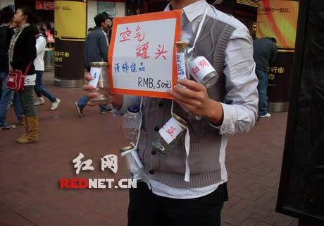 “發(fā)寶氣的吧?太扯淡了,竟然叫賣(mài)空氣!”23日傍晚,網(wǎng)友“閃賞”在紅網(wǎng)論壇發(fā)帖爆料,稱(chēng)自己當(dāng)天下午在長(zhǎng)沙黃興路步行街逛街,在黃興銅像旁看到一男子臉上戴著面具,全身掛滿了寫(xiě)著陽(yáng)朔、三亞、可可西里、九寨溝字樣的玻璃瓶,手舉“空氣罐頭,50元”的紙牌,引來(lái)不少人圍觀。男子自稱(chēng)空氣是從全國(guó)各地方收集來(lái)的,屬他勞動(dòng)成果,所以他有理由出售而贏利。