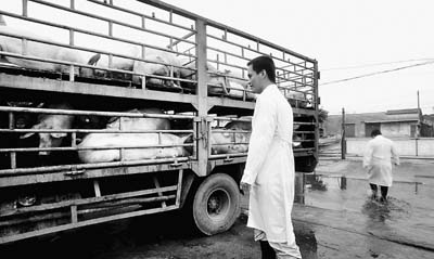 3月23日晚廣州市天河牲畜交易市場(chǎng)的“挑燈夜戰(zhàn)”,讓記者深切感到了給這批遠(yuǎn)道而來的生豬做“體檢”的不易:一大群檢疫部門的工作人員圍住豬圈,30多頭肉豬被隔離其間。工作人員進(jìn)到里面,拿根棍子捅捅這個(gè),趕趕那個(gè),讓它們歇不下來,看哪頭豬有要尿尿的意思,迅速拽耳朵的拽耳朵,拖腿的拖腿,拿瓶的拿瓶……