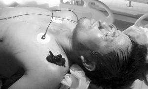 在同仁醫(yī)院急診室,記者見到了受傷的民工。他躺在病床上動彈不得,兩邊耳廓后面還在流血,左邊肩部,一根比拇指還粗的螺紋鋼筋,從腋下一直穿到肩部,肩膀外面露出一寸多長的鋼筋頭。鋼筋還被一層布包著,那是民工的衣服,鋼筋戳到他時(shí),衣服也被一起戳進(jìn)了肉里。