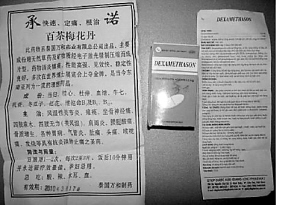 該藥是日前在對我省部分市縣藥品市場的監(jiān)督檢查中發(fā)現(xiàn)的。在其外包裝上,藥品名稱標(biāo)示為 “DEXAMETHASON”,生產(chǎn)企業(yè)標(biāo)示為“THUOC BAN THEO DON”,包裝盒內(nèi)另附有一份“百茶梅花丹”的中文說明,稱該藥為泰國萬和藥業(yè)生產(chǎn),是所謂進(jìn)口藥品,為東南亞“抗炎消腫止痛之圣藥”。