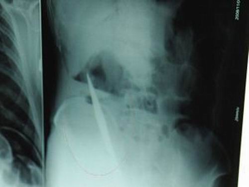昨天(11月6日)上午,記者在徐州礦務(wù)集團(tuán)總醫(yī)院重癥監(jiān)護(hù)室見到了這名男子,目前他雖然已經(jīng)恢復(fù)了意識(shí),但還不能開口說(shuō)話,需要呼吸機(jī)輔助呼吸。據(jù)醫(yī)生介紹,4日中午12時(shí)左右,這名男子因服毒輕生被緊急送到醫(yī)院進(jìn)行搶救,之前,這名男子已經(jīng)在當(dāng)?shù)剜l(xiāng)鎮(zhèn)醫(yī)院進(jìn)行了近20小時(shí)的治療,但效果不佳。“病人被轉(zhuǎn)院到礦總院時(shí)已神志不清,血壓極低,處于休克狀態(tài)。”救護(hù)人員給男子洗胃、初步處理以后,發(fā)現(xiàn)男子呼吸急促,于是趕緊給他拍片檢查。結(jié)果讓所有的醫(yī)生大吃一驚,竟有一把尖狀異物橫在該男子腹腔內(nèi)!當(dāng)天下午5時(shí)30分,輕生男子被推上了手術(shù)臺(tái)。經(jīng)過(guò)40多分鐘的手術(shù),該男子腹腔被打開,手術(shù)醫(yī)生發(fā)現(xiàn),男子體內(nèi)的金屬狀異物竟然是一把長(zhǎng)19厘米的尖刀!