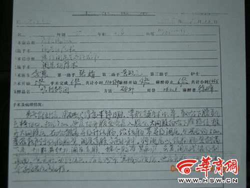 6月26日,張女士再次來到西安市第四醫(yī)院,復(fù)印出當(dāng)時的住院病案,病案顯示3年前的那個手術(shù)共進(jìn)行了110分鐘,并在醫(yī)院當(dāng)時的手術(shù)記錄里,主治醫(yī)師李震在“手術(shù)及病理情況”一欄,用手寫體如此描述了當(dāng)時的手術(shù)情況:“患者仰臥位……沿結(jié)腸帶尋及闌尾,見其長約五厘米,萎縮粘附于結(jié)腸腸壁,闌尾系膜高度水腫。將闌尾從結(jié)腸腸壁剝離下來,切斷并結(jié)扎闌尾系膜……切除之標(biāo)本家屬看后送病檢!