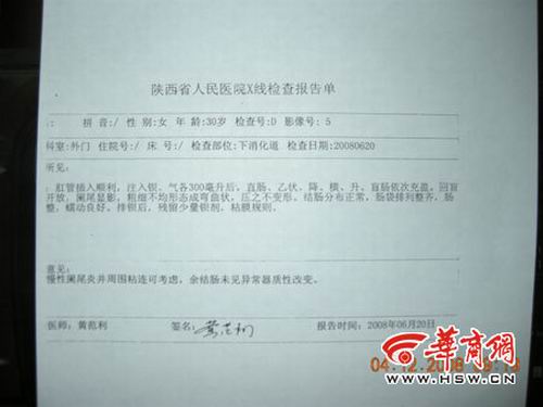 2005年9月12日上午,張女士因慢性闌尾炎急性發(fā)作住進(jìn)了西安市第四醫(yī)院,并于當(dāng)天下午進(jìn)行了闌尾切除手術(shù)。 2008年5月,張女士和丈夫打算要個孩子,于是在省婦幼保健院做了相應(yīng)檢查,醫(yī)生認(rèn)為張女士腹部的反復(fù)疼痛將影響日后的正常妊娠,建議查明疼痛病因并徹底治愈后再行懷孕。于是,6月份她來到陜西省人民醫(yī)院進(jìn)行病因檢查,另她意想不到的是,省人民醫(yī)院出具的X射線檢查報(bào)告顯示,疼痛系闌尾發(fā)炎引起。為證實(shí)這一令人窒息的結(jié)果,她又在第四軍醫(yī)大學(xué)進(jìn)行復(fù)查,并經(jīng)多名專家會診,得出與省人民醫(yī)院完全相同的結(jié)論——闌尾未被切除。