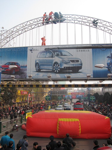 考慮到該男子的人身安全,飯店老板當(dāng)場(chǎng)答應(yīng)拿出100塊錢對(duì)其補(bǔ)償,然而廣告架上的男子突然改變了注意,提出了一個(gè)荒唐的理由,聲稱要市長(zhǎng)到場(chǎng)自己才肯下來(lái)。時(shí)間一秒一秒的過(guò)去了,僵持還在繼續(xù),所有的勸說(shuō)都是徒勞,此時(shí)廣告架下邊的的救生氣墊也出現(xiàn)了意外,原來(lái),向氣墊里充氣的充氣機(jī)因長(zhǎng)時(shí)間使用,機(jī)器的油料快用完了,于是現(xiàn)場(chǎng)指揮員立即對(duì)充氣機(jī)進(jìn)行了更換。由于現(xiàn)場(chǎng)圍觀群眾太多,指揮員馬上與大隊(duì)取得了聯(lián)系請(qǐng)求消防二中隊(duì)前來(lái)增援。