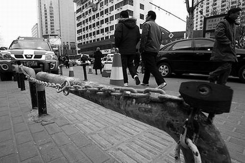 昨天下午5時許,銀行下班,保安再次將鐵鏈扯到東側鎖好,問到為何要在門前上鎖,對方稱防止往里停車,“萬一絆倒人咋辦?”梁先生問。“不會的,鏈子有顏色!北0舱f。“那光線暗的時候咋辦?”追問之下,對方無話可說。