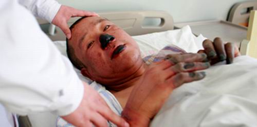 昨日(1月14日),記者在省武警醫(yī)院見到尹某,心頭不禁一震。尹某面部被嚴重凍傷,均已腫脹,鼻子和下唇均壞死,變成黑色,手和腳用紗布包著,看到黑色的指頭。