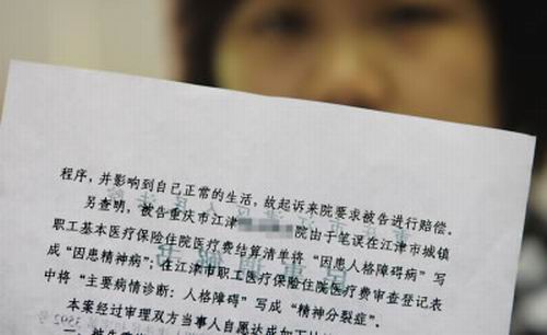 昨日,小玫趕到重慶向記者出示了調(diào)解書(shū)。法院查明,當(dāng)初醫(yī)院在小玫醫(yī)保住院醫(yī)療費(fèi)結(jié)算清單中將“因患人格障礙病”寫(xiě)成“因患精神病”和在“職工醫(yī)保費(fèi)用審查登記表”病情診斷一欄中將“人格障礙”寫(xiě)成了“精神分裂癥”,都是筆誤。經(jīng)過(guò)調(diào)解,醫(yī)院愿意將上述兩處“筆誤”改過(guò)來(lái),即把精神病的鑒定刪去,不過(guò)依然保留對(duì)患者有“人格障礙”的結(jié)論。小玫說(shuō)作為調(diào)解的條件,她放棄了6萬(wàn)元的索賠請(qǐng)求。