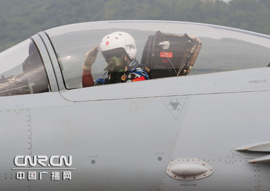 勝利返航,航空兵某師副師長(zhǎng)、空軍特級(jí)飛行員嚴(yán)鋒招手致意。