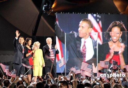 圖為奧巴馬夫婦和拜登當晚在芝加哥慶祝勝利。中新社發(fā) 李靜 攝