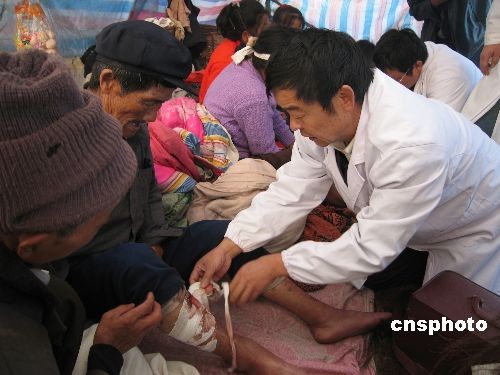 圖為十一月六日,楚雄市醫(yī)院副院長(zhǎng)杜國(guó)才正在安置點(diǎn)為一位骨折災(zāi)民包扎傷口,因醫(yī)療條件有限,目前只能做緊急處理。