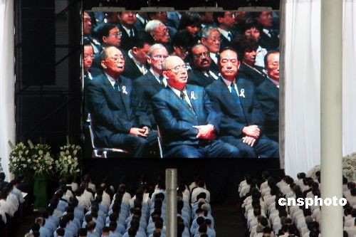 圖為在第二告別分場(chǎng)中央熒幕上正直播主場(chǎng)所的情景,可見有中國(guó)國(guó)民黨主席吳伯雄、親民黨主席宋楚瑜等臺(tái)灣政界人士。