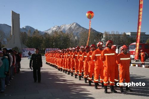 圖為擔負消防、救災(zāi)等任務(wù)的西藏救援武裝力量首次集體亮相。