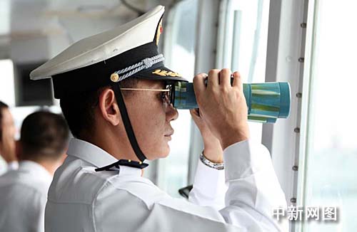 圖為“?凇碧枌(dǎo)彈驅(qū)逐艦政委劉健忠在觀察前方海域海況。中新社記者 孫自法 攝