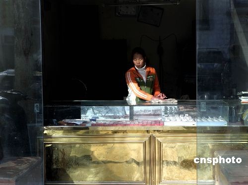 3月14日,店面林立的拉薩市商業(yè)購物街朵森格路,一家藏飾品店早早開門,服務員正在忙著收拾店面迎接顧客。中新社發(fā) 劉震 攝