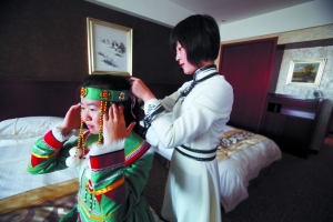 昨日,蒙古族女孩韓笑幫鄂溫克族女孩蘇玉秀綁頭飾。她們將和另外110名各族青少年一起參加國(guó)慶慶典。本報(bào)記者 孫純霞 攝