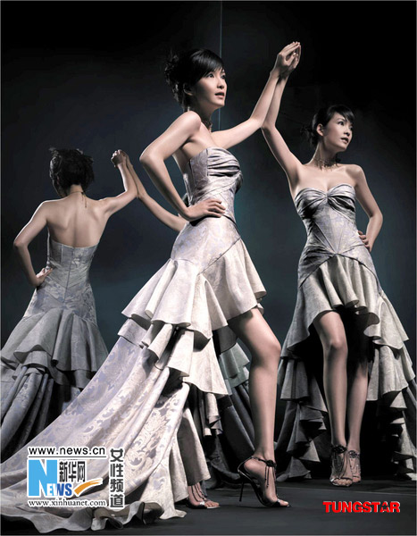 要配合“舞會焦點”的主題,一襲舞會晚裝當然是必備。著名時裝設計師Henry Lau為周慧敏度身訂造的晚裝,是古典宮廷禮服及現(xiàn)代簡約晚裝的融合,高貴典雅且性感迷人,上身的貼身低胸束衣剪裁細膩,完全展現(xiàn)周慧敏的腰臀曲線;而下身的短裙設計能突出雙腿的線條美,加上拖尾裙擺更顯高貴華麗。整件晚裝更用上Henry特別從倫敦收集回來的古董布匹縫制而成,份外珍貴;而由于繡上金線花紋圖案的布料較重,整件晚裝重達15磅。