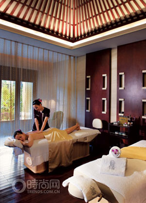 大堂所在地是一座高高在上的宮殿式建筑,檐角高挑,莊重有儀,進(jìn)來后,一條長長的木廊道直通向光的盡頭,皇家的氣派表露無遺。整個酒店的設(shè)計靈感則來自北京頤和園的經(jīng)典建筑設(shè)計,包括斜尖屋頂、深色實木、復(fù)雜細(xì)致的雕刻和馬賽克鑲嵌裝飾等,精品購物店的外墻讓人熟悉地看到天安門城樓的影子,而名為“雪閣”的雪茄吧看上去就像微縮的天壇。這是亞龍灣面積最大的酒店,空間足夠開闊,除了主體建筑和附屬設(shè)施外,33座備有私人管家及獨立泳池的私家別墅散落在亞龍灣幽靜的細(xì)白沙灘和紅樹林保護(hù)區(qū)之間,據(jù)說每座別墅都有露天日光浴平臺,還有水天相接的無邊際泳池,這種奢華而私密的家庭度假并不適合一個人來此的我。在去往房間的通道里,一樣能感受得到酒店空間上的奢華:所有的房間都只靠一側(cè),走廊的另一側(cè)是通透的玻璃大窗,風(fēng)景不只屬于陽臺,走路的人也可以看到風(fēng)景!