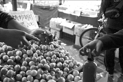 昨天,市民杜女士來到四道口明光寺批發(fā)市場的水果大廳購買橘子。她試吃了一家的橘子后感覺很甜,于是買了這家水果攤的橘子。但到家后她發(fā)現(xiàn),買來的橘子并不甜。一些常在該市場買水果的鄰居告訴了杜女士“水果刀的秘密”,隨后她再次返回該市場,親眼目睹了橘子“甜”的真正原因。昨天下午,記者來到四道口明光寺批發(fā)市場的水果大廳,見到一名攤主身邊有一個飲料瓶,飲料瓶在中間被挖掉一塊,瓶里裝著甜水。當記者說要購買水果時,攤主主動從那只裝水的塑料瓶中取出水果刀,切開水果讓記者品嘗。記者趁機蘸嘗了塑料瓶中的水,果然很甜。
