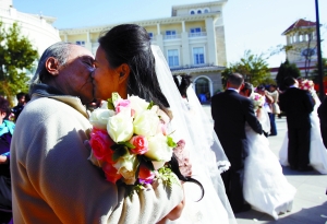 “你愿意做我妻子嗎?”81歲的吳介琴單膝跪地向愛人蔣曉輝求婚時(shí),在場親朋給予3分鐘的掌聲。昨日,與另十對網(wǎng)戀成功的情侶一起,81歲的吳介琴與小自己23歲的蔣曉輝走進(jìn)結(jié)婚殿堂;楹笏麄儗⒃谒拇ㄉ。