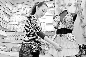 根據(jù)劉女士提供的線索,記者來到沙坪壩三峽廣場這家賣安全套首飾品的小店。該店店面不大,貨架上擺滿了各類用安全套做成的飾品,有手機鏈、棒棒糖、錢包套、筆記本、獲獎證書、刺繡護身符、喜糖等數(shù)十個品種。醒目位置還擺放著一個身上戴著各種安全套飾品的塑料模特。
