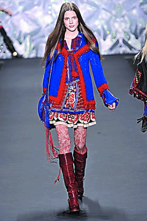 不愿意把沉悶帶進(jìn)秋冬的設(shè)計(jì)師大有人在。彩虹般的印花圖案、鮮活的色彩組合還有新藝術(shù)式的刺繡,更別提軋花皮革的靴子、天鵝絨花朵的頭飾、串珠項(xiàng)鏈和佩里斯紋緊身衣……今年秋冬的設(shè)計(jì)Anna Sui相對(duì)其歷次的發(fā)布,算是最華麗繁復(fù)的。對(duì)于Anna Sui粉絲來說,這種將具有不同歷史性的藝術(shù)風(fēng)格大膽混融的手法,相較于前幾季,則顯得較孤芳自賞,像是如虹光般的印花、或是熱情活潑的配色處理,以及一些刺繡花紋和手工雕刻過的靴款、天鵝絨印花帽飾、串珠項(xiàng)鏈、迷幻的渦紋花呢緊身上衣…等等,盡管花俏,卻也成為Anna Sui2008秋冬系列的一大特色。